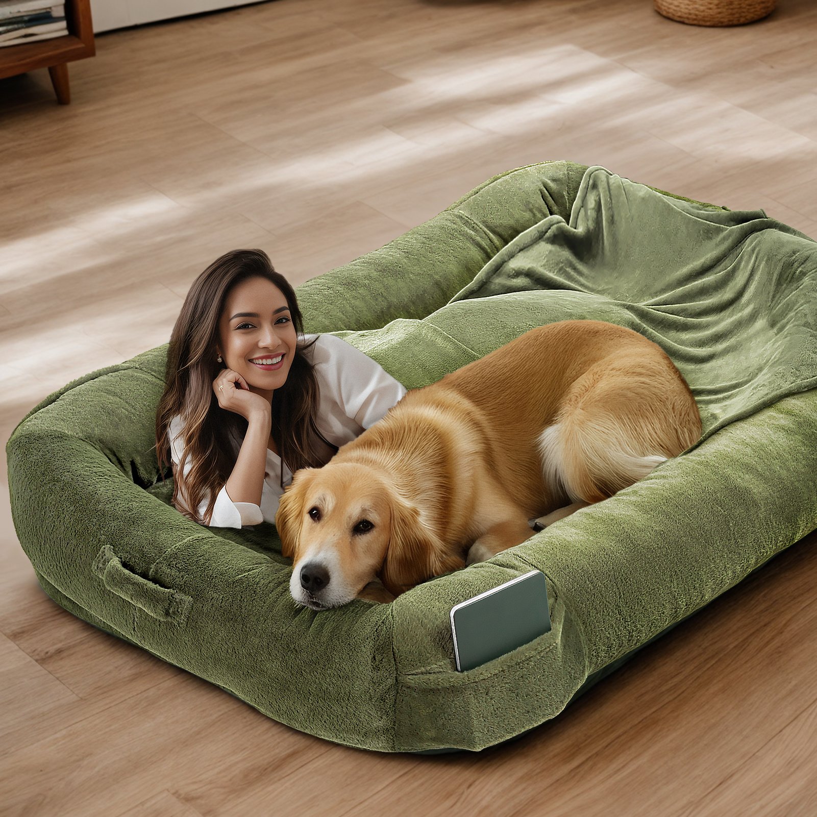 3.ALL YOU NEED IS A HUMAN DOG BED: With overall dimensions of 72"x48"x10", the square design of the Giant Dog Bed provides enough practical space for you to rest and interact with your pet. The four pockets allow you to instantly store items at any angle without having to turn around to look for them. Designed with two handles, the human sized dog bed is ready to go, saves time and is the perfect alternative to air mattress, foldable mattress and floor bed!